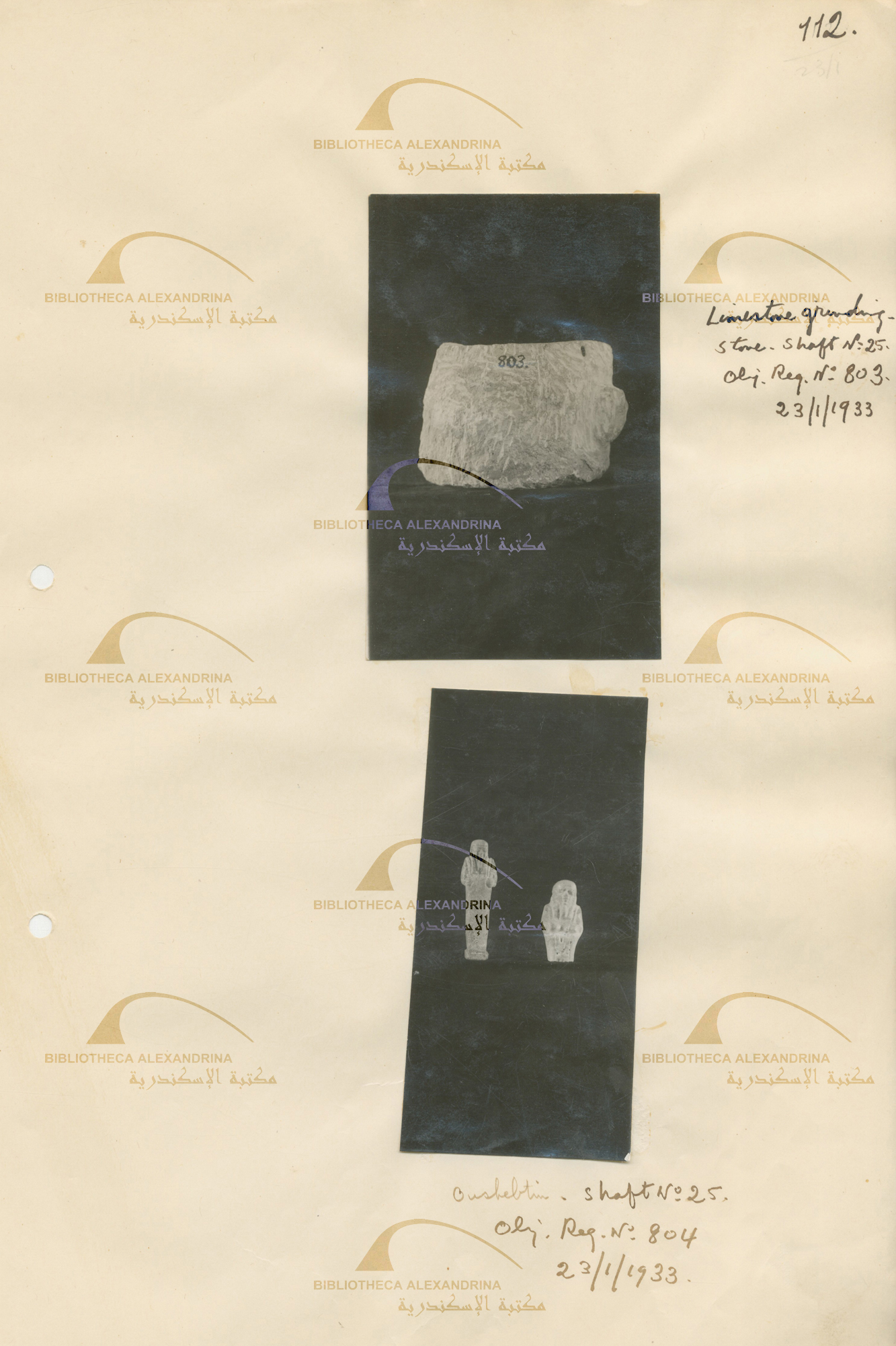 Upper : Limestone grinding stone shaft no.25 Object registration no.803 23/1/1933 Down: Oushebtin. Shaft No 25 Object registration no.804 23/1/1933