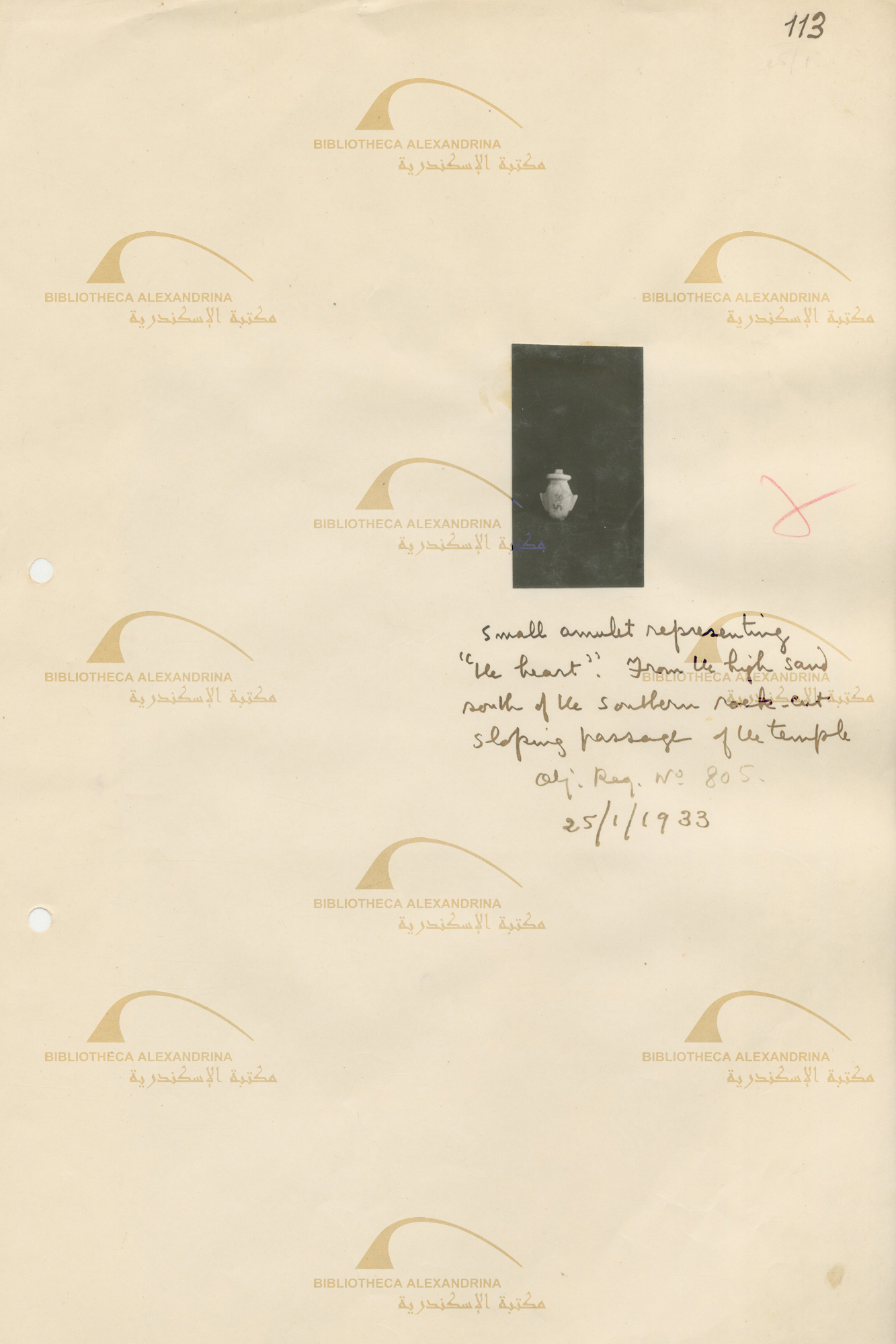 Small amulet representing '' The heart '' from the high sand north of the southern rock-cut sloping passage of the temple Object registration no. 805 25/1/1933