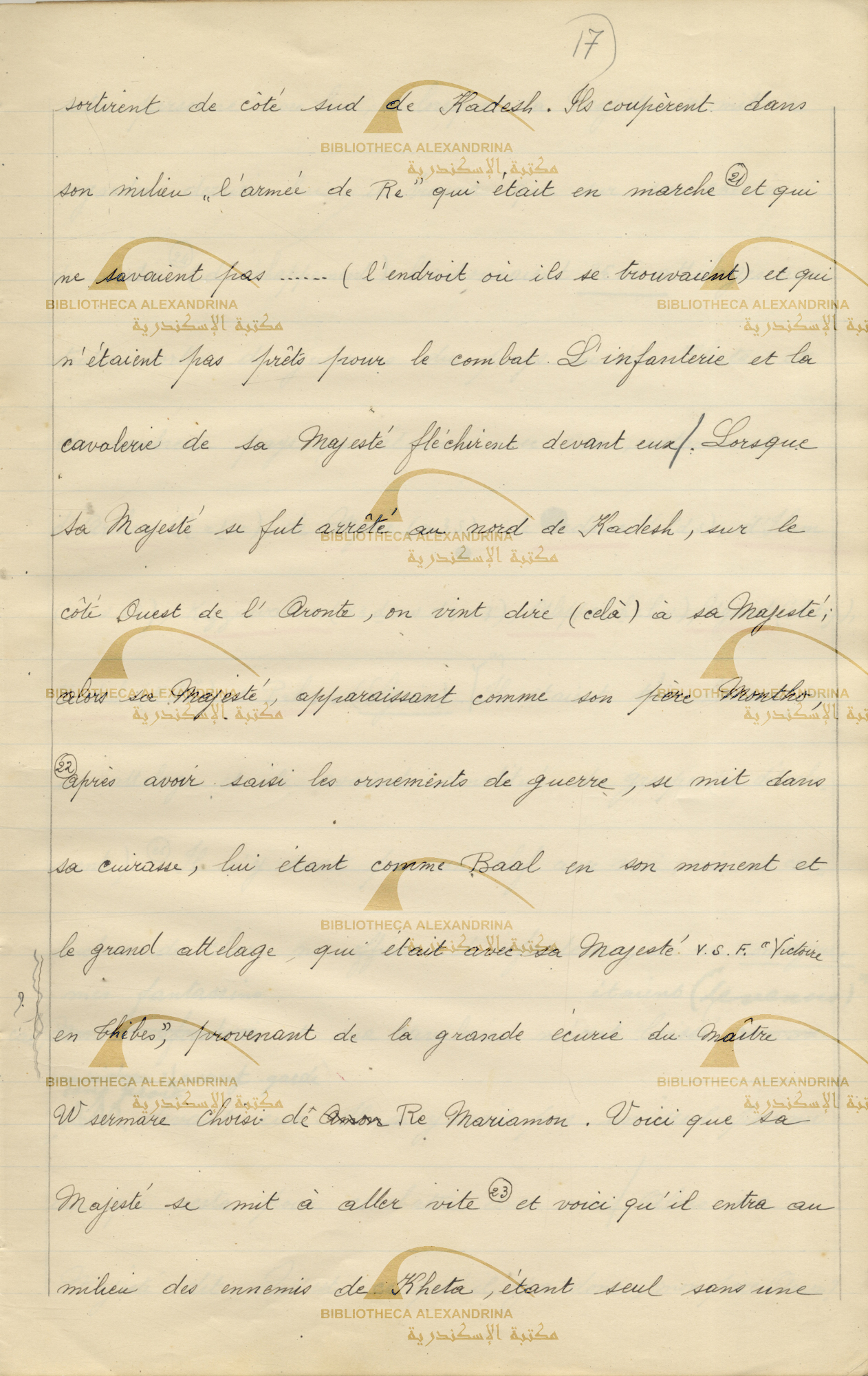 The Poem of Pentaur, translation in french " Le Poème de Pentaour " By Selim Hassan form line 21, 22, 23.