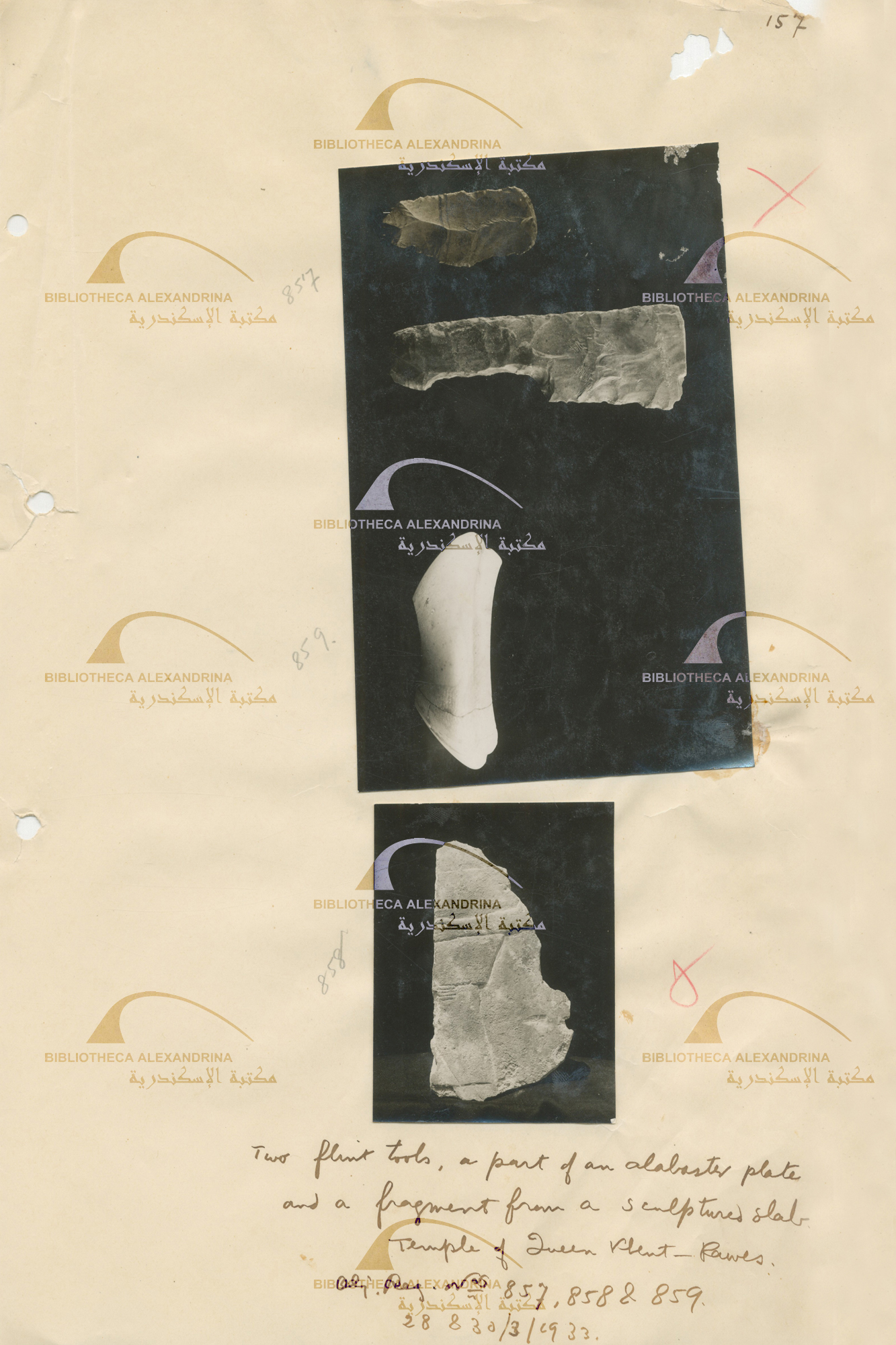 Two flint tools . A part of an alabaster plate and a fragment from a sculptured slab Temple of Queen Khent-kawes Object registration no. 857 , 858 & 859 28&30/3/1933