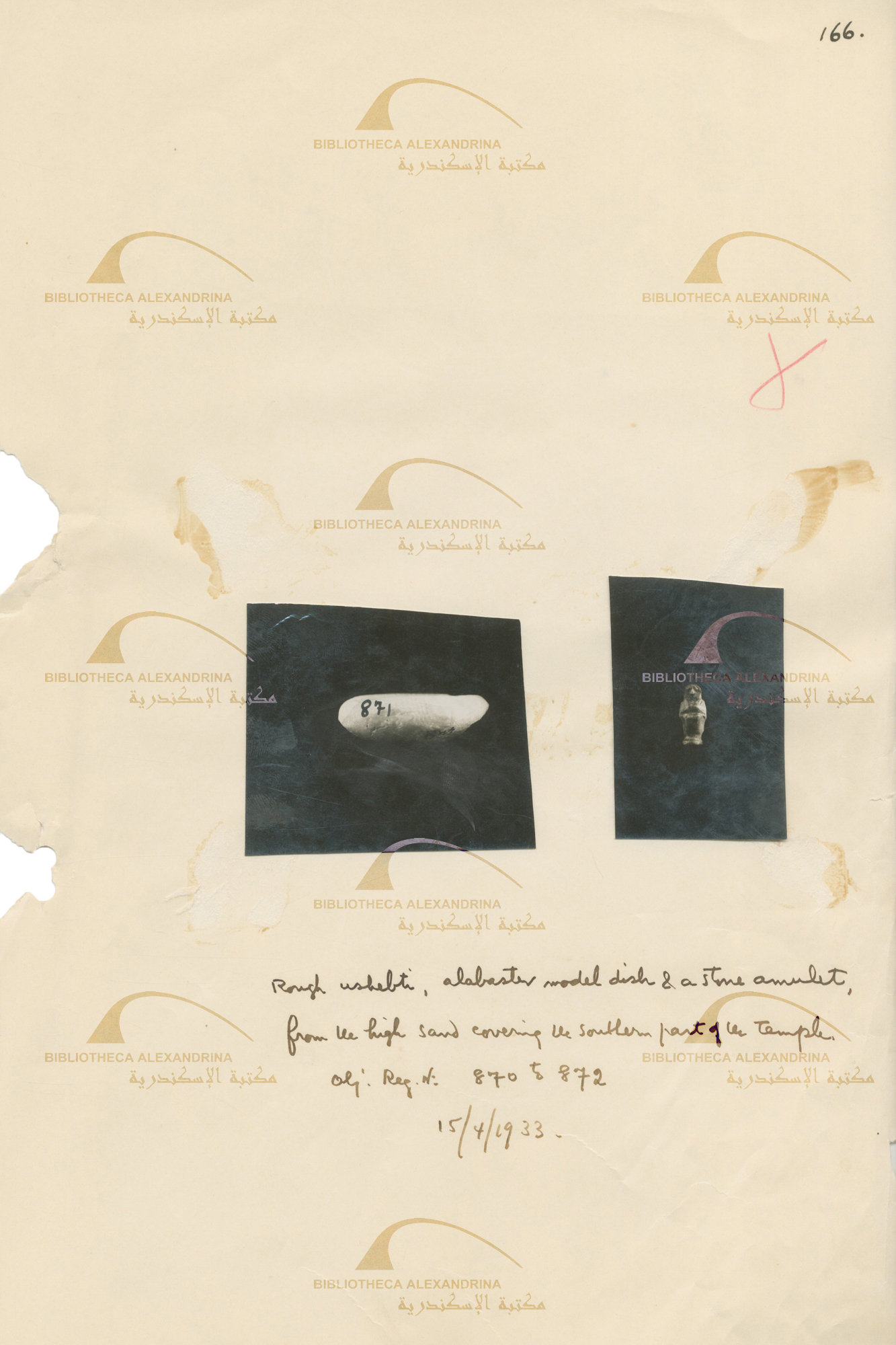 Rough ushebti , alabaster model dish & a stone amulet from the high sand covering the southern part of the temple. Object registration no. 870 to 872 15/4/1933