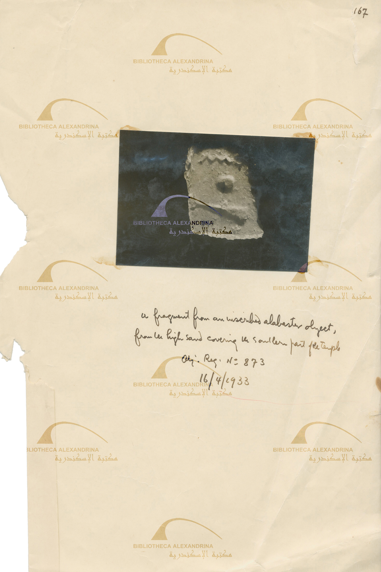 A fragment from an inscribed alabaster object from the high sand covering the southern part of the temple. Object registration no. 873 16/4/1933