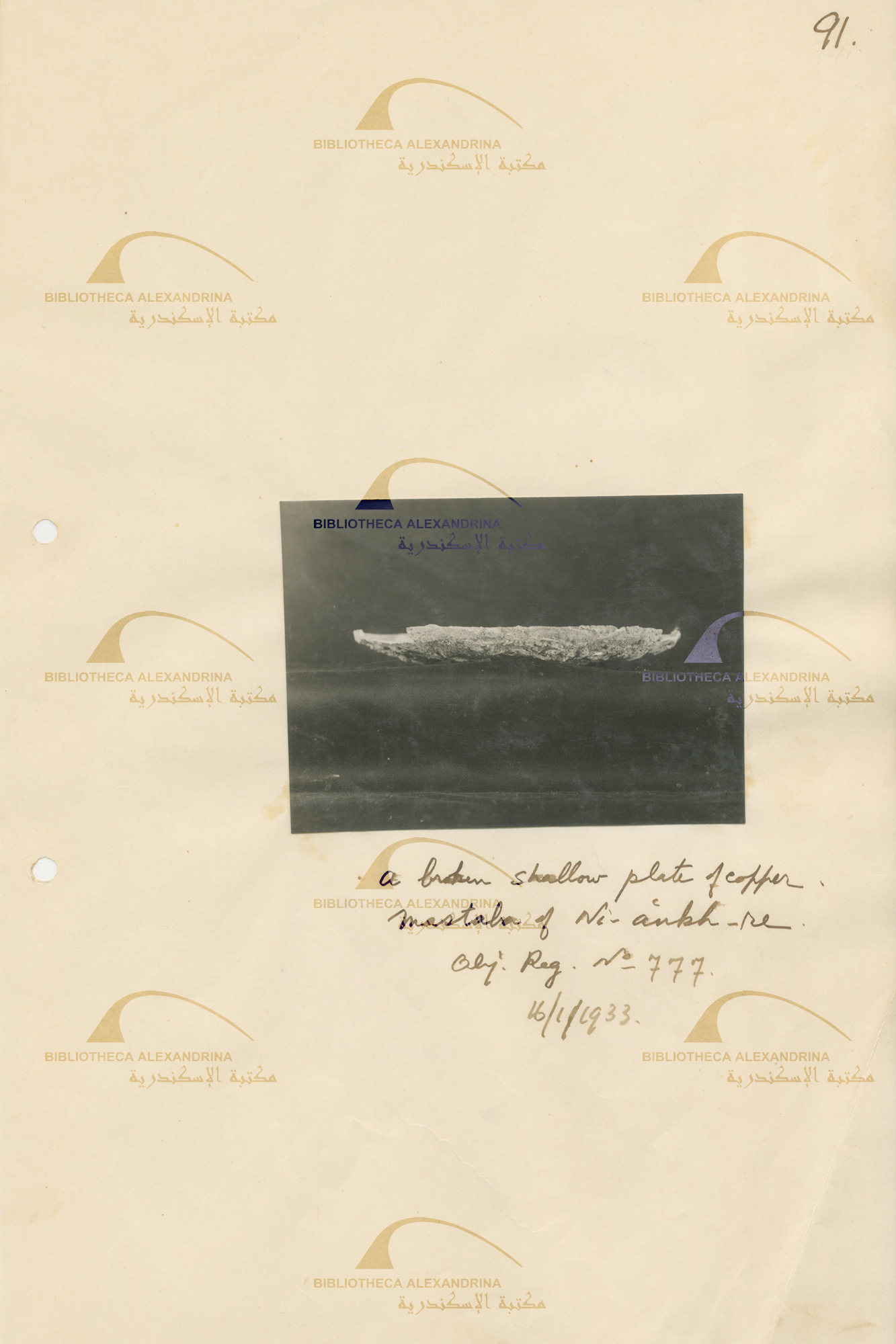 A broken shallow Plate of copper mastaba of Ni-ankh-re Object registration no.777 16/1/1933